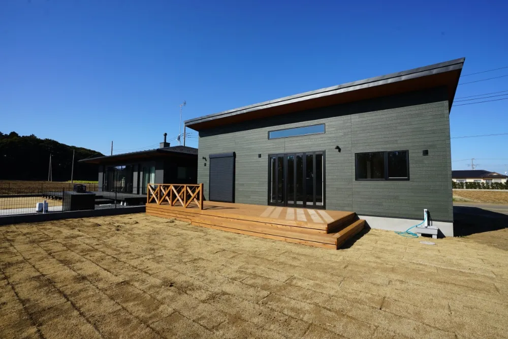 深みのあるモスグリーンの外観のウッドデッキが映える平屋建てとなっております。 現在外構工事を施工中です。